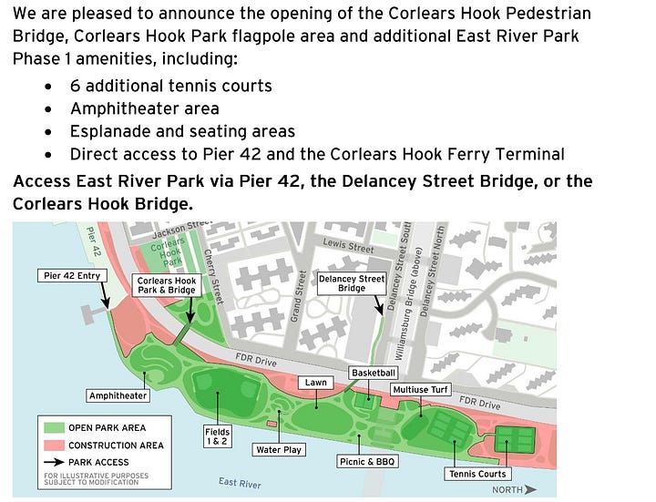 After years of construction, another major portion of East River Park has re-opened to the public. The newly minted Corlears Hook Pedestrian Bridge will lead visitors straight into the renovated amphitheater and onto a path that connects East River Park with Pier 42 and the NYC Ferry stop. This is the biggest change to East River Park's geography since the grand opening of the area south of the Williamsburg Bridge on Memorial Day weekend this year.