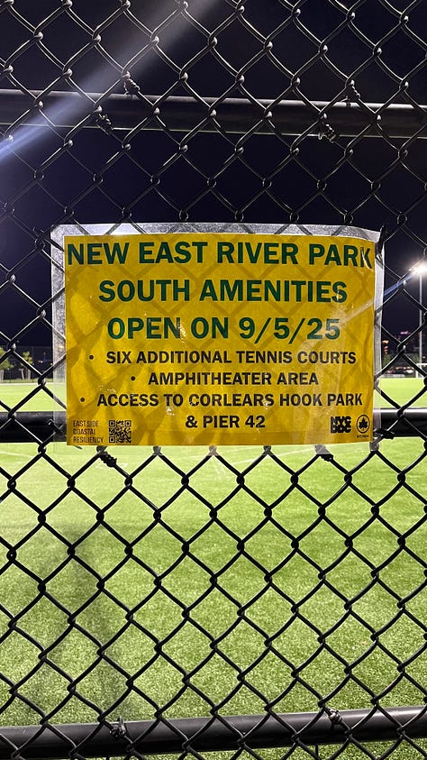 Also, tennis players, if you weren't already happy enough this week with the US Open, six more courts are opening on the north side of the opened portion of the park. Have your day. Impress your friends with your backyard amenities. Make them regret leaving you for the excesses of Brooklyn. Have the last laugh.