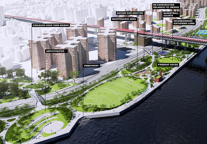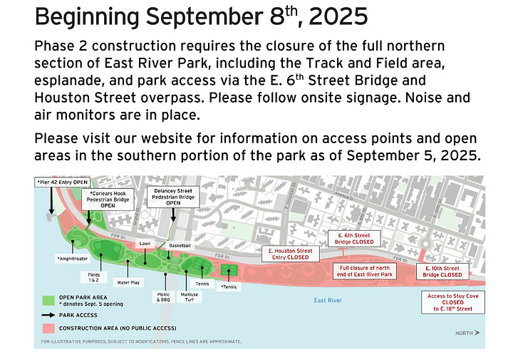For our neighbors just north of us in the East Village, genuine condolences for your slice of East River Park. On Monday, September 8th, the iconic East River Track and Esplanade are closing for at least three years of renovations; along with it, the East Houston Overpass and that poor excuse for a bridge called the East 6th Bridge. However, if the new portion of park south of the Williamsburg Bridge has shown us anything these past three months, it's that the wait is worth it.